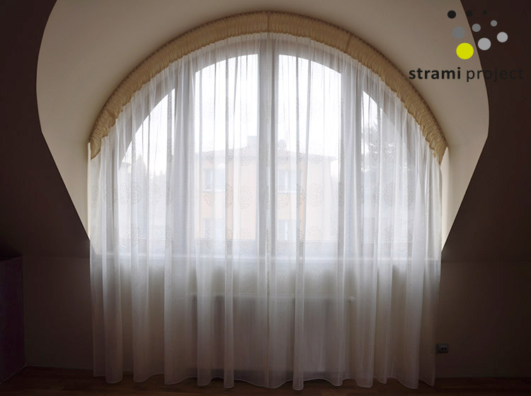 firana na taśmie z obszyciem w półokrągłym wykuszu
